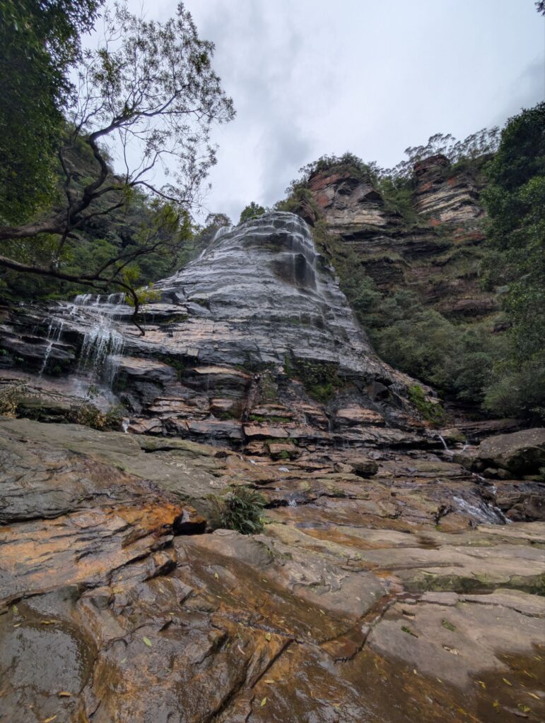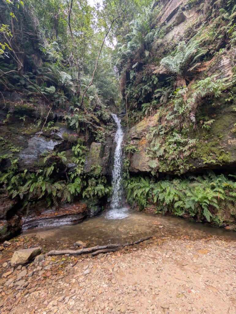 Von diesem Parkplatz aus starten wir unsere rund fünfstündige Wanderung durch den „Dschungel“ der Blue Mountains. Der Weg führt vorbei an unzähligen Aussichtspunkten mit wunderschönem Ausblick sowie mehreren Wasserfällen. Unterwegs sehen wir mehrere Echsen und verschiedene Vogelarten, einen Vogel hören wir nur, bekommen ihn aber leider nicht zu Gesicht.