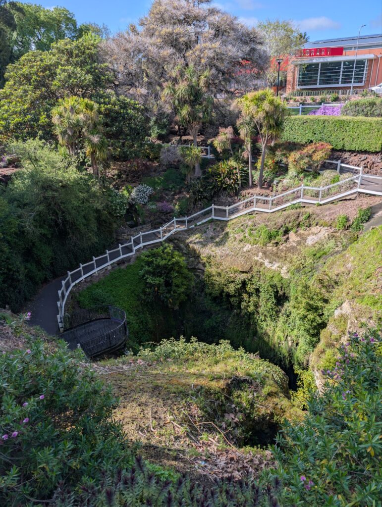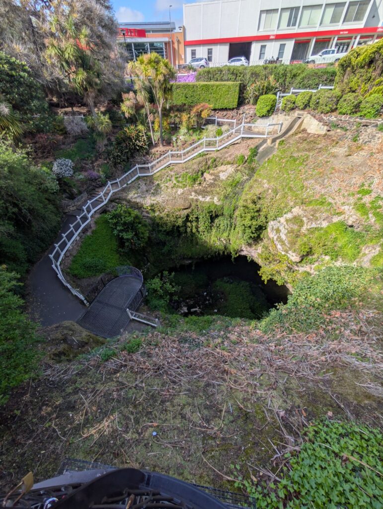 Danach fahren wir weiter zum Umpherston Sinkhole, ebenfalls ein Senkloch, das bereits um 1860 zu einem Garten für die Anwohner angelegt wurde. Damals gab es dort sogar einen kleinen See, heute stehen unten Parkbänke, und der Ort lädt zum Verweilen ein. An heißen Sommertagen muss das ein sehr angenehmer Platz sein.