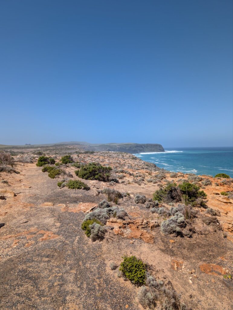 Auf dem Rückweg treffen wir einen Australier aus Byron Bay (NSW), der mit dem Auto den gesamten Süden Australiens bereist. Er schläft im Zelt und ist insgesamt vier Wochen unterwegs. Im Gespräch empfiehlt er uns, zum Crumpets Beach zu fahren, dort könne man mit etwas Glück einen Seeelefanten aus nächster Nähe sehen.