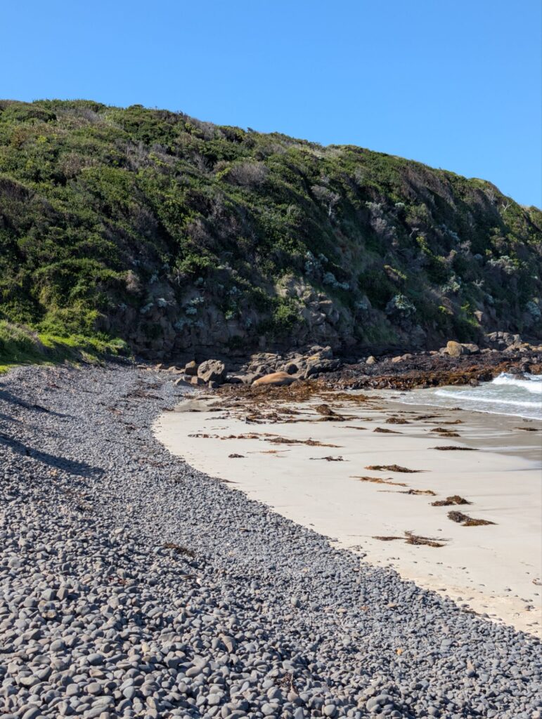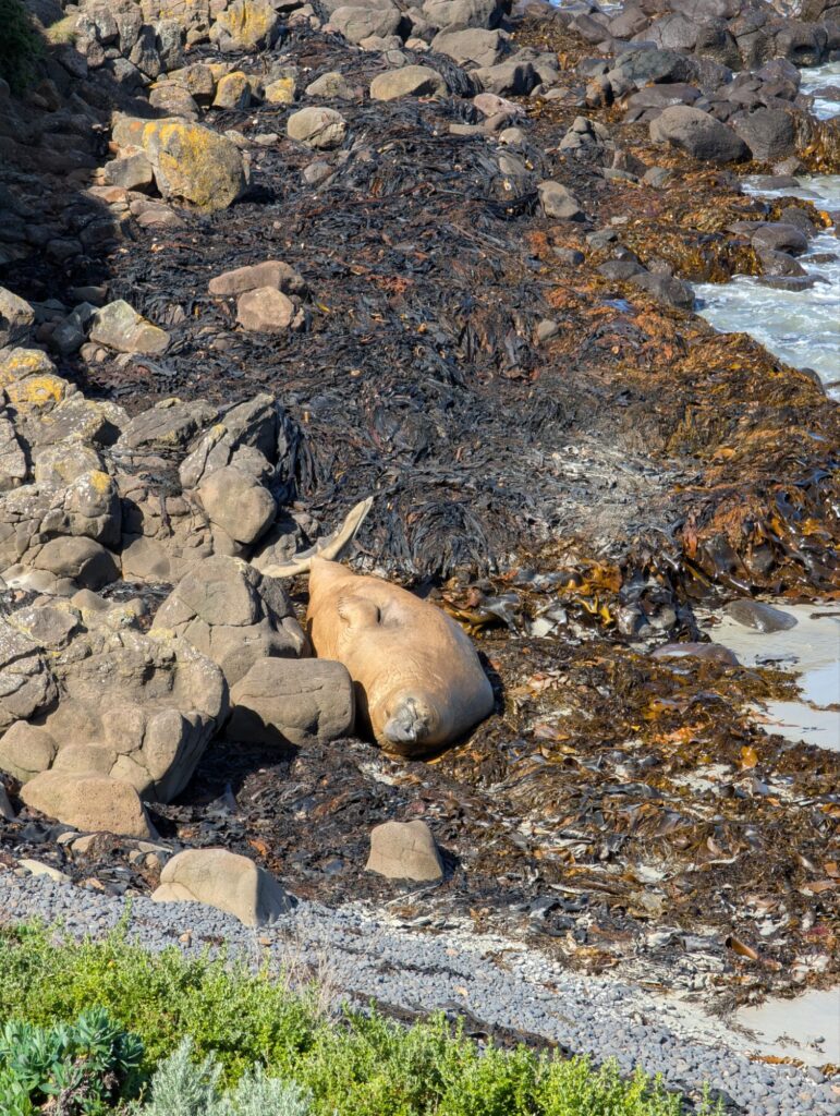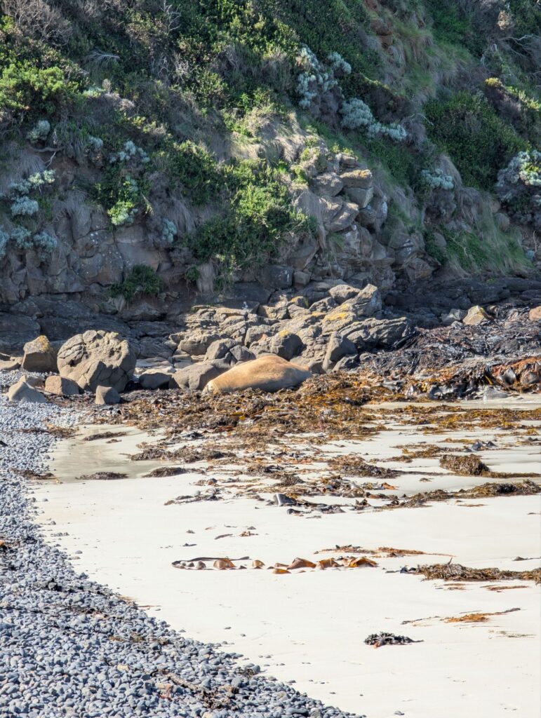 Also fahren wir dorthin, etwa 25 Minuten. Tatsächlich haben wir Glück, der Seeelefant ist da! Er ist etwa vier bis fünf Meter lang, laut Internet werden sie bis zu sechs Meter groß. Auf die Entfernung ist das aber schwer zu schätzen. Nach etwa 15 Minuten Beobachtung fahren wir weiter in Richtung Port Campbell, unserer nächsten Station für eine Nacht. Die Fahrt dauert rund anderthalb Stunden.