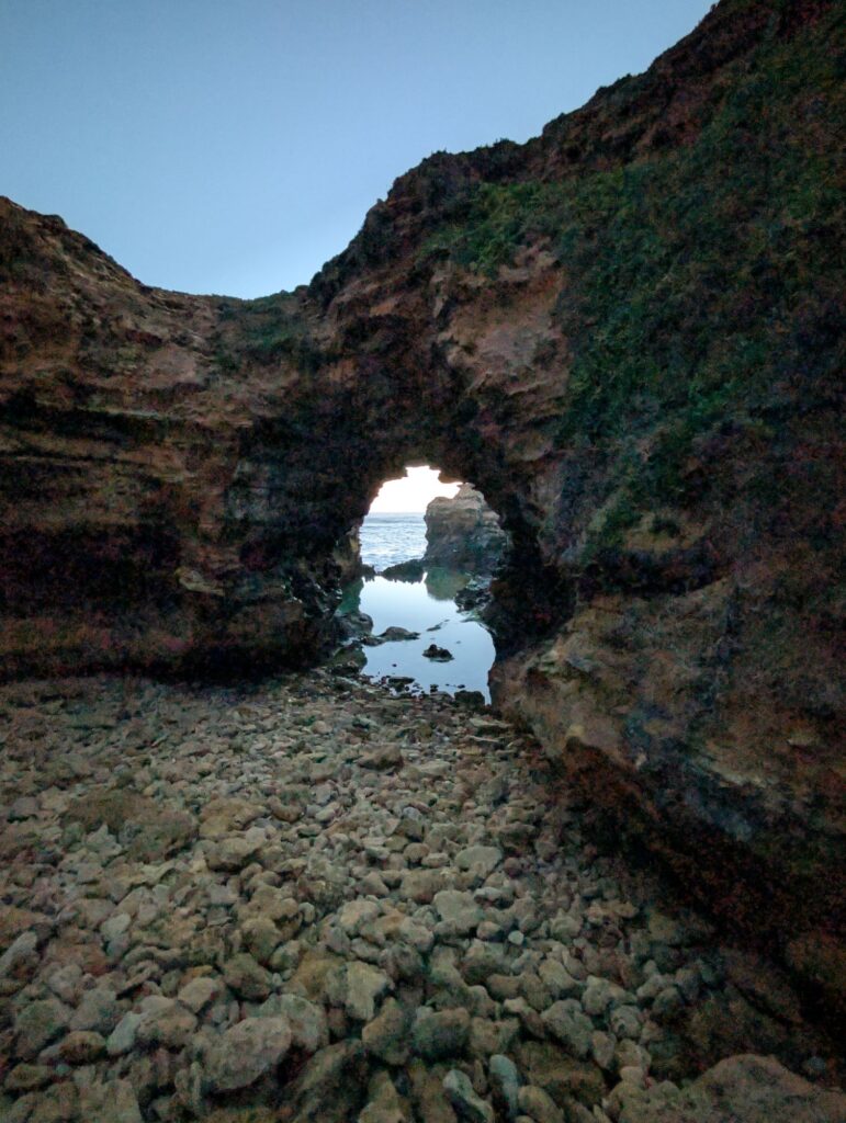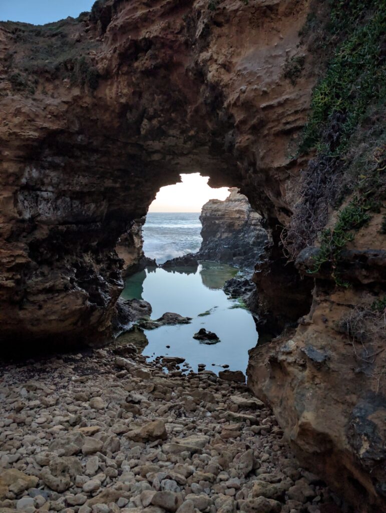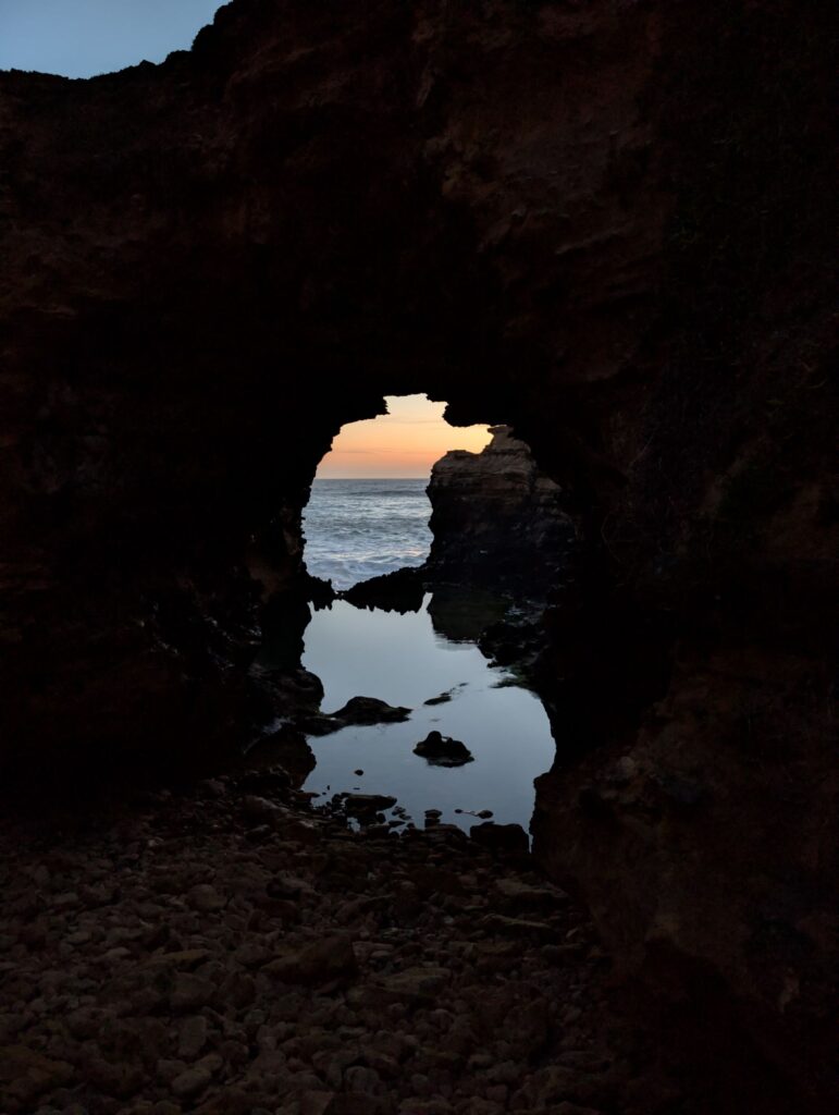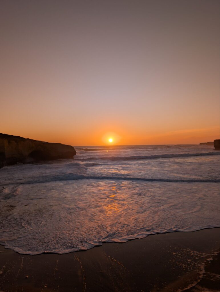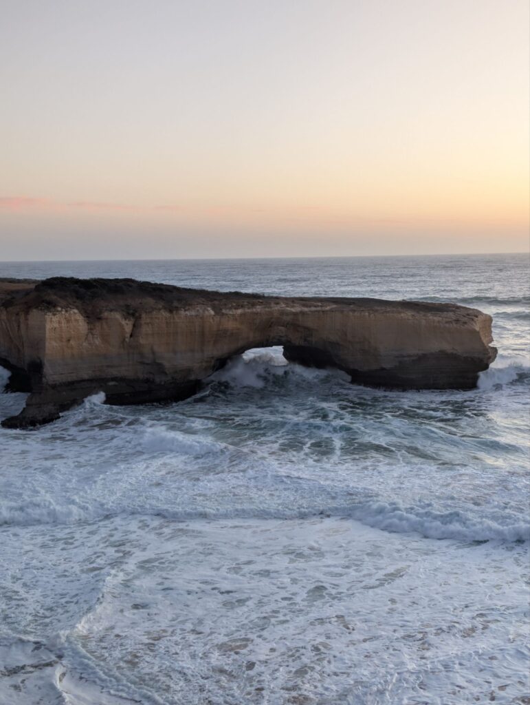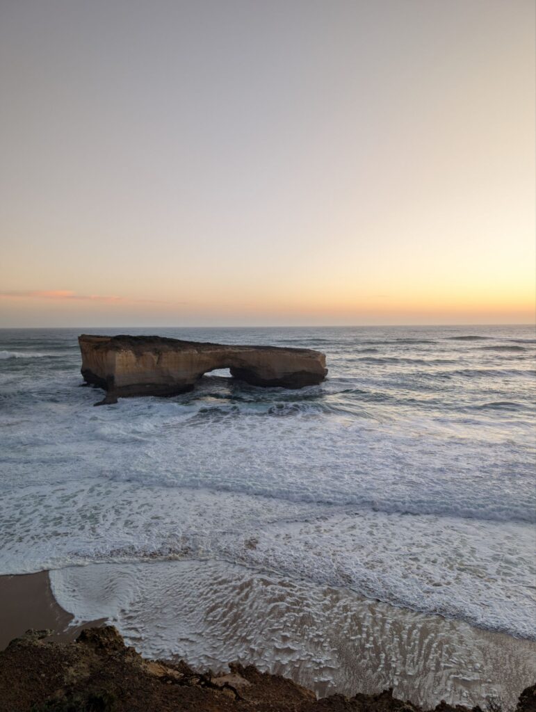Angekommen holen wir den Schlüssel ab, sehen uns kurz das Zimmer an und fahren dann zur australischen London Bridge, um den Sonnenuntergang anzuschauen – ein wunderschöner Abschluss des Tages. Danach halten wir noch kurz am Aussichtspunkt The Grotto, bevor es zurück in die Unterkunft geht.