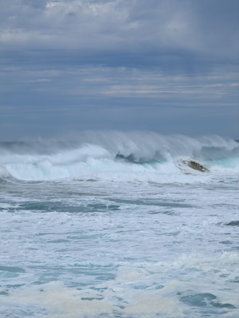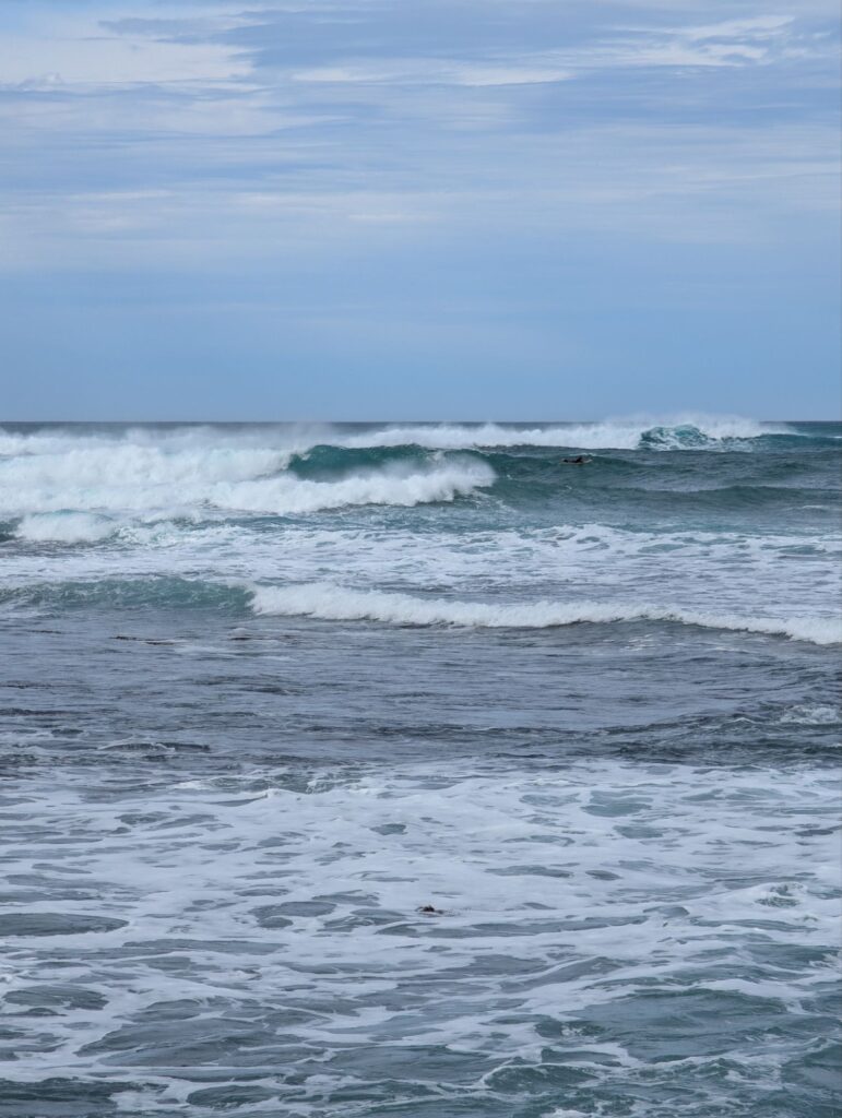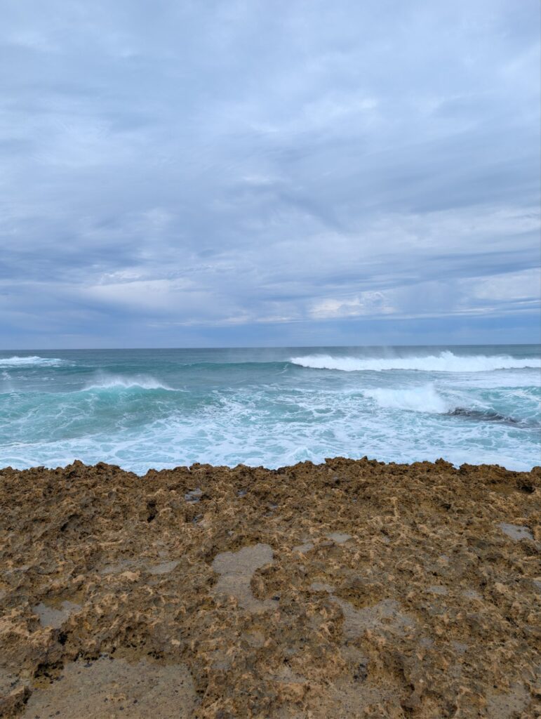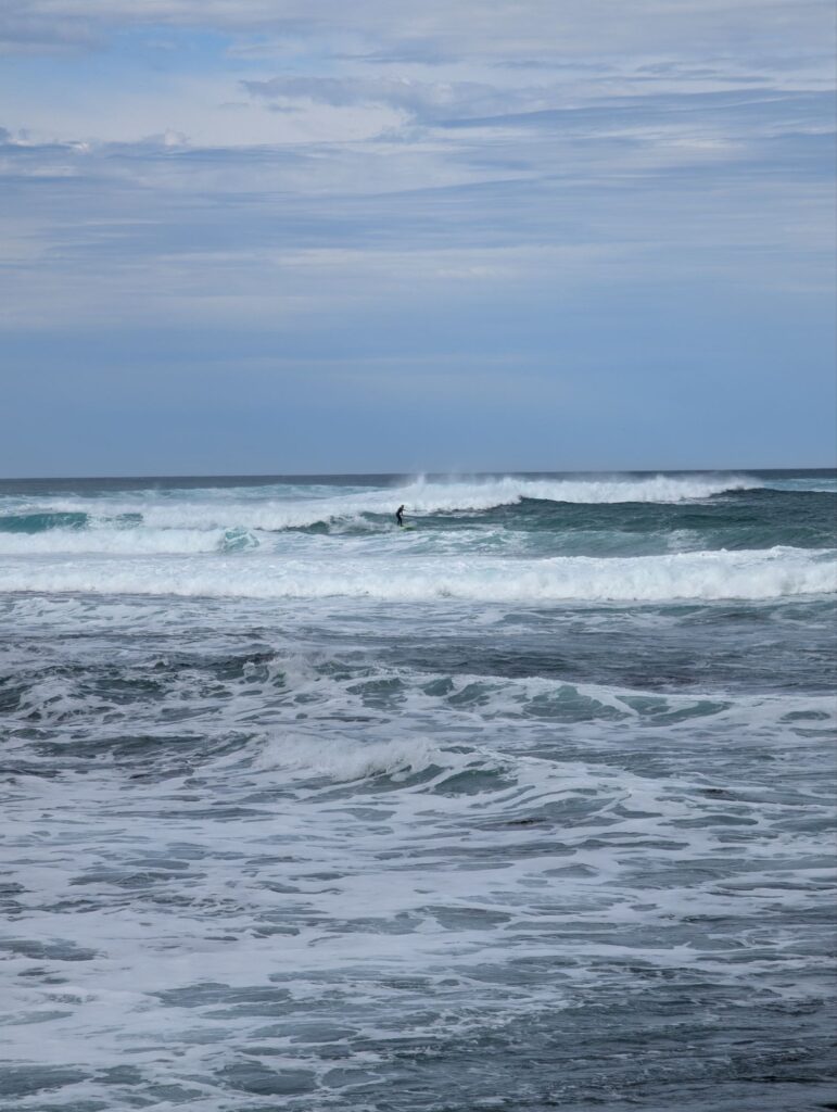 Gegen 10:00 Uhr machen wir uns wieder auf den Weg und packen das Auto. Bevor wir losfahren, schauen wir noch kurz in der Bucht von Port Campbell vorbei. Das Meer zeigt wunderschöne Wellen, und drei Surfer sind draußen im Ozean.