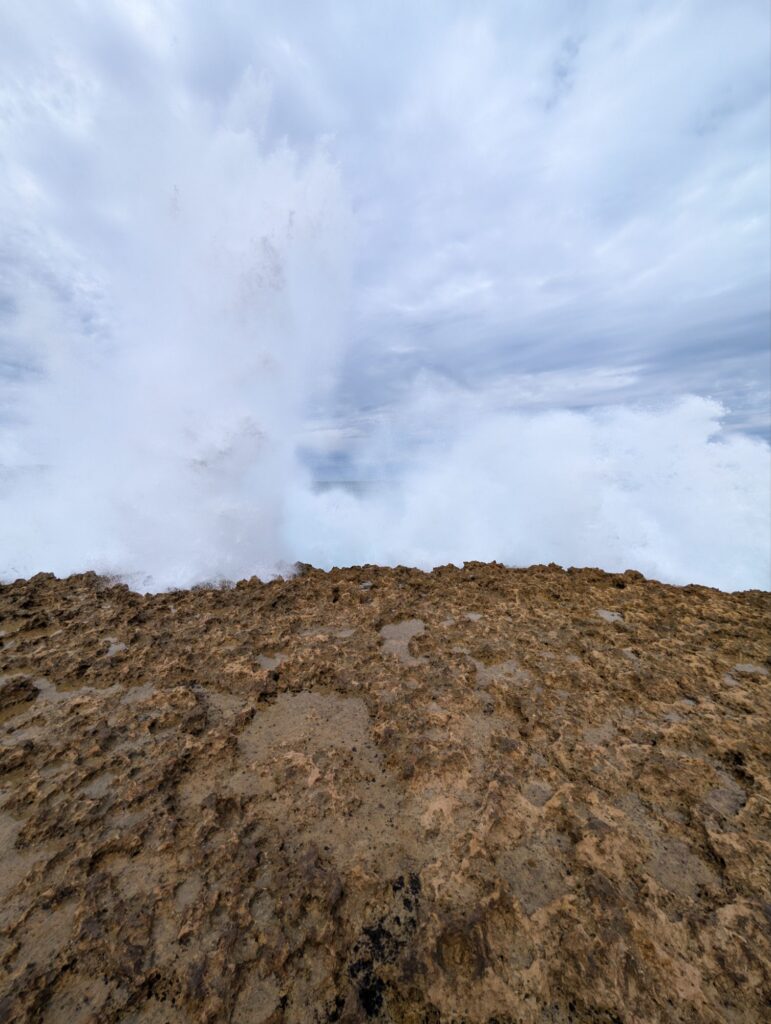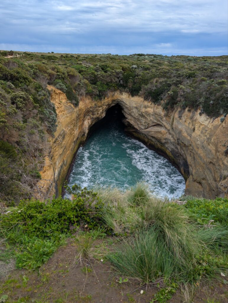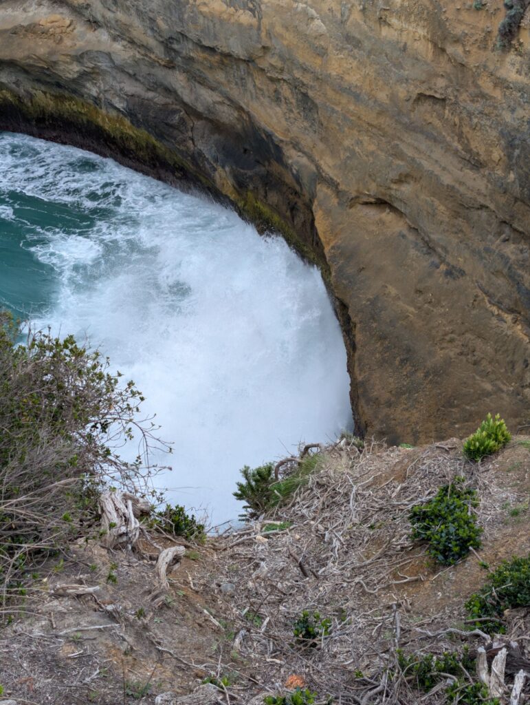 Von Loch Ard Gorge geht es weiter zum Poombeeyt Koontapool Lookout, einem Loch im Felsen, das durch einen rund 90 Meter langen Tunnel mit dem Ozean verbunden ist. Die Wellen werden durch den Tunnel gedrückt und prallen dann lautstark gegen die Felswände, dem könnte ich stundenlang zusehen.