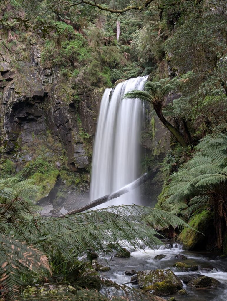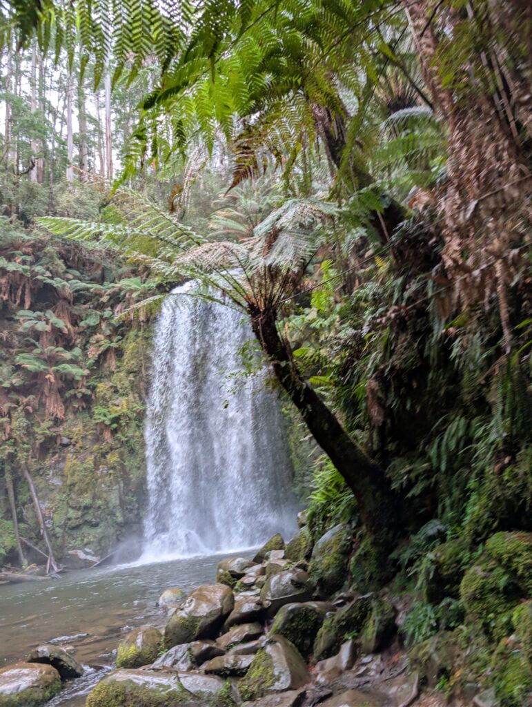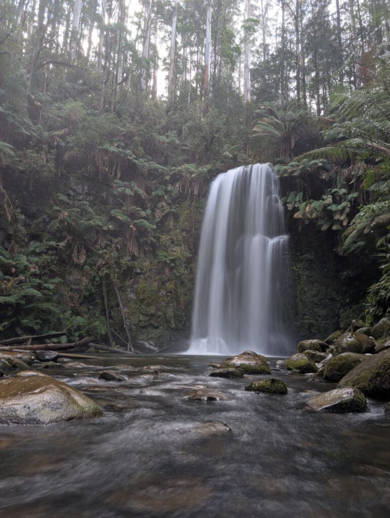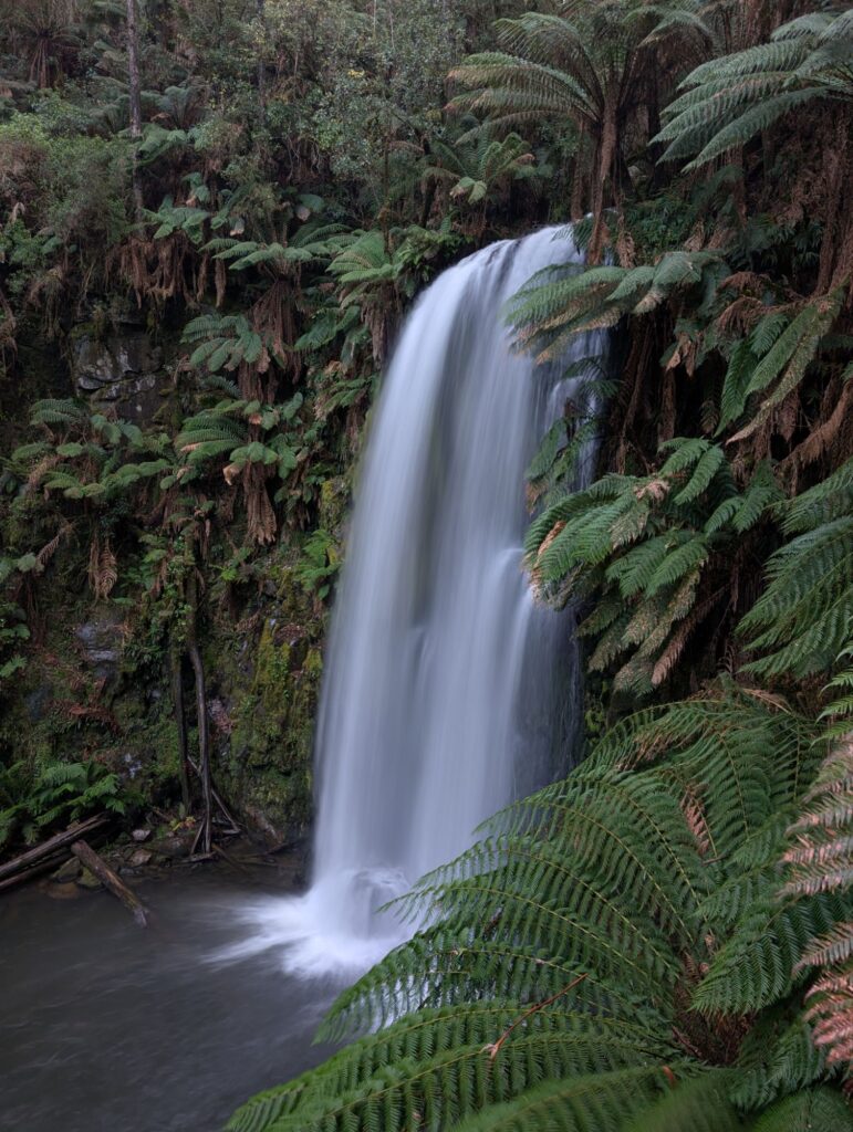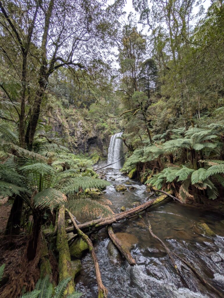 Nach etwa 55 Minuten erreichen wir den Hopetoun Waterfall. Er liegt mitten im Wald, ist aber nur ein paar Gehminuten vom Parkplatz entfernt.