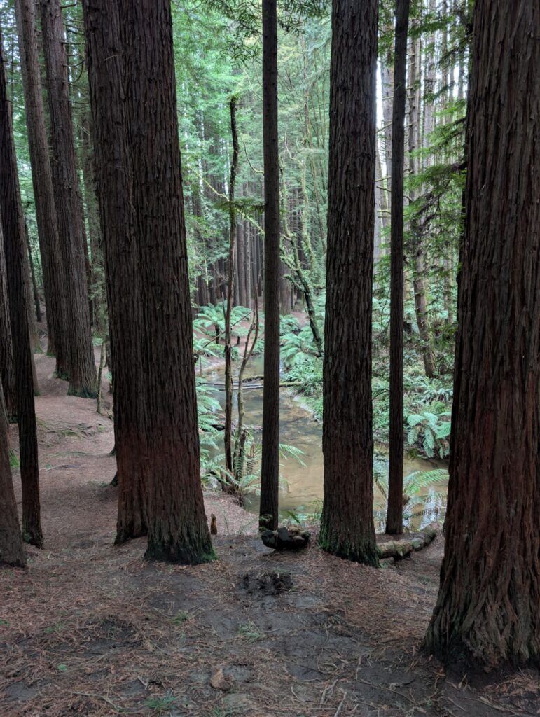 Danach geht es weiter zu den California Redwoods, einem Wald mit sehr hohen, rötlich gefärbten Bäumen. Besonders an den umgefallenen Stämmen erkennt man gut, wie schön die Holzfarbe leuchtet. Nach einem kurzen Spaziergang durch den Wald fahren wir weiter.