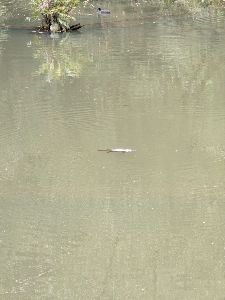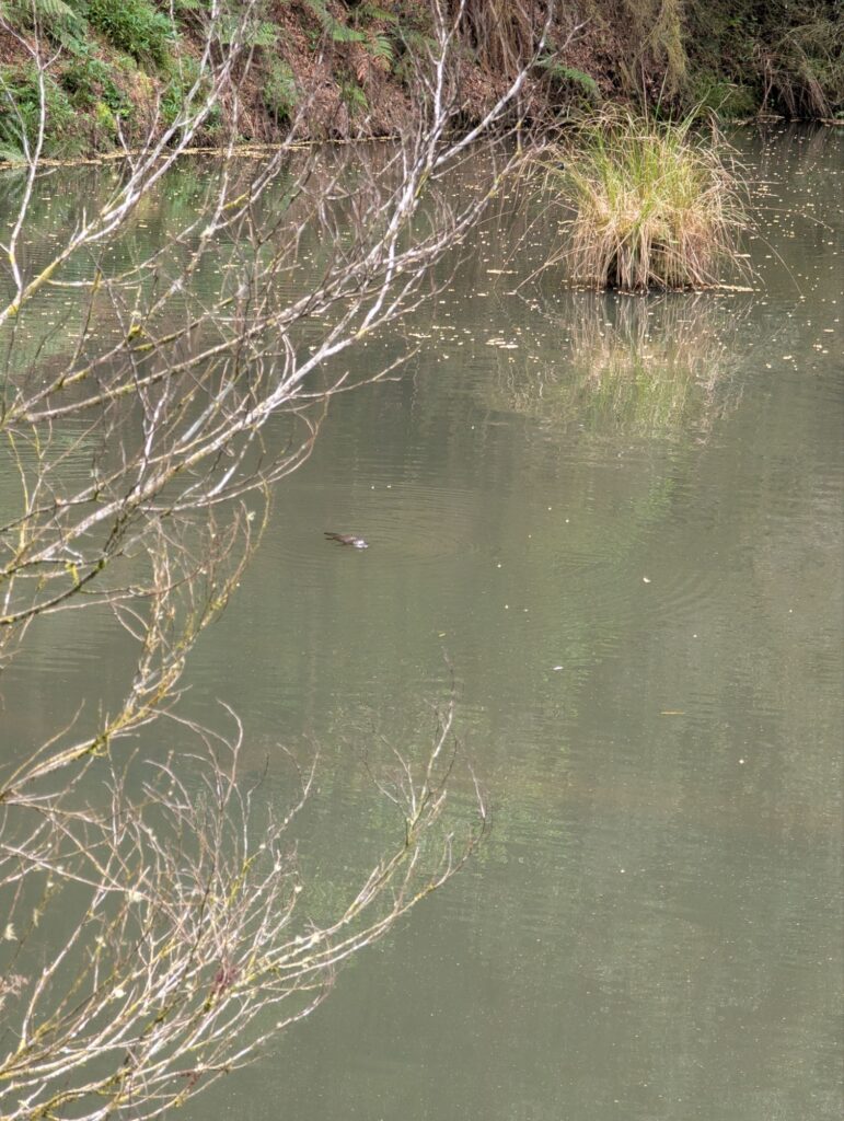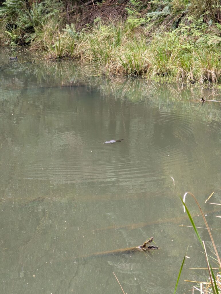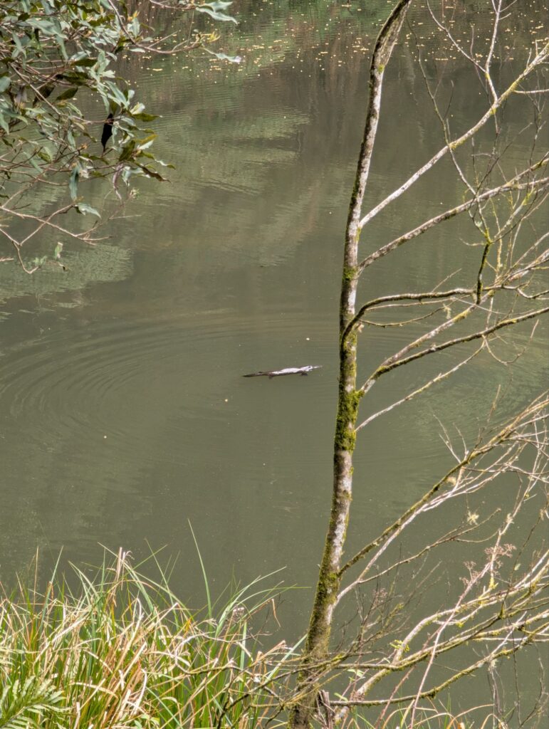 Der eigentliche Grund für unseren Besuch: Catrin will ein Schnabeltier sehen. Sie hat herausgefunden, dass es im See welche gibt, und jetzt heißt es: Augen auf! Anfangs sehen wir nur kurz eine Bewegung im kleinen Neben-See, aber das Tier taucht sofort wieder ab. Es sah erst aus wie ein Stück Holz, war es aber sicher nicht. Nach einiger Zeit entdeckt Catrin beim zufälligen Hinschauen tatsächlich ein Schnabeltier! Immer wieder taucht es für ein paar Sekunden auf, um Luft zu holen, dann verschwindet es wieder unter Wasser. Wir machen zahlreiche Fotos und Videos und verbringen sicher eine halbe Stunde damit, dieses seltene Tier zu beobachten.