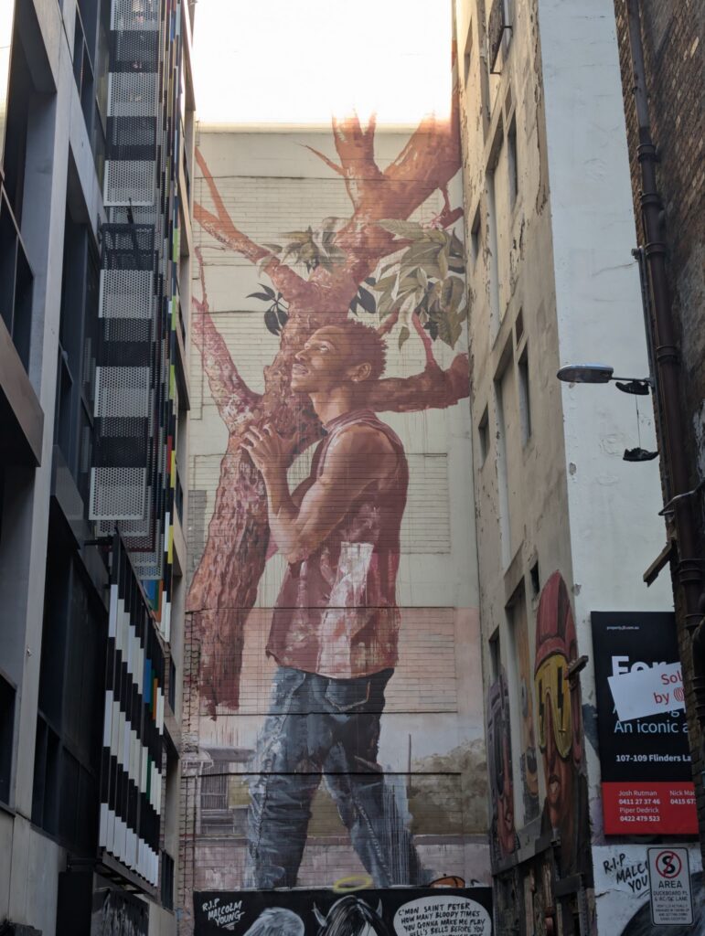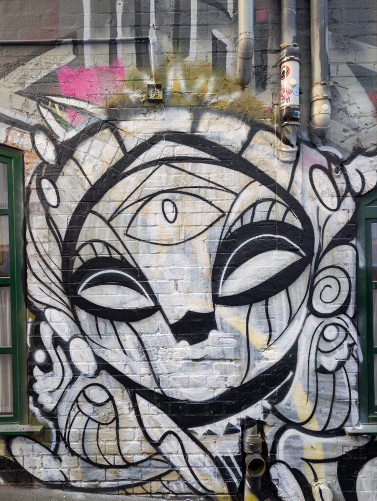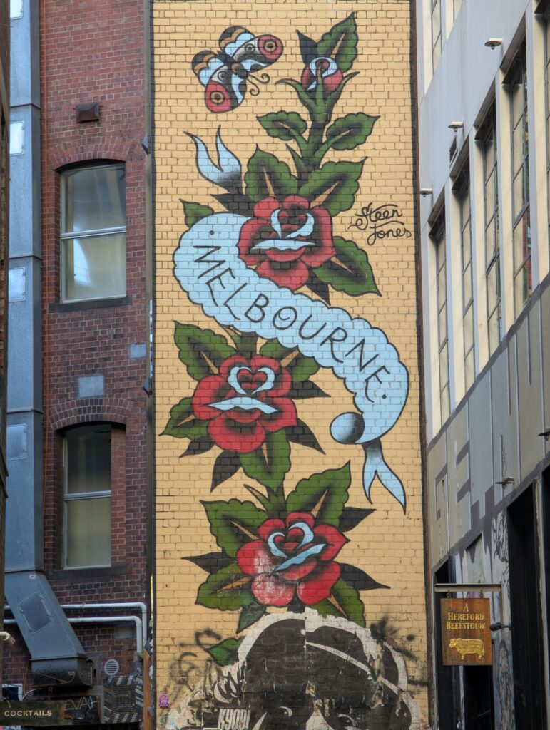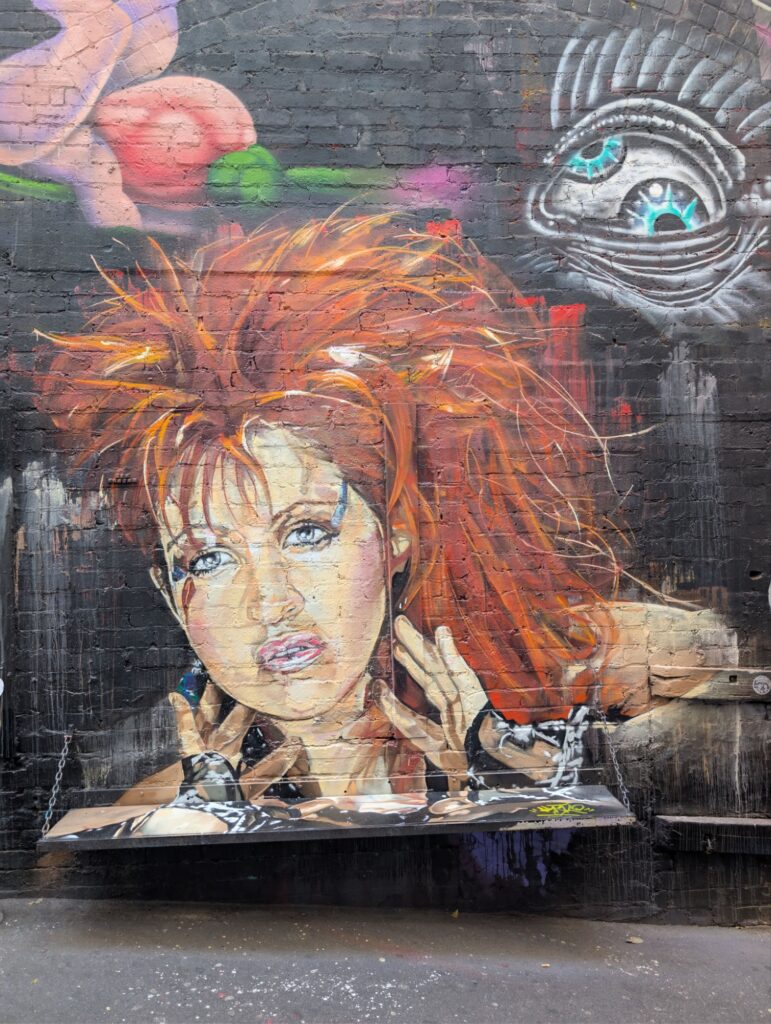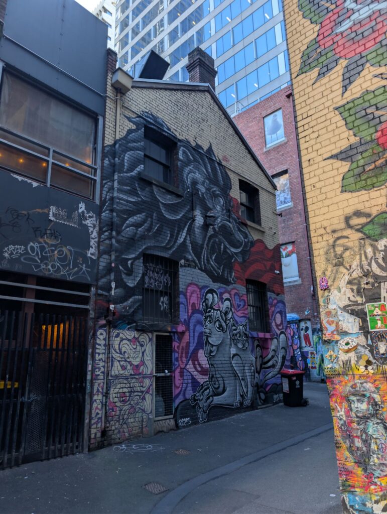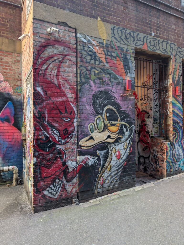 Der erste Stopp heute ist die AC/DC Lane, in der ebenfalls viele Graffitis zu sehen sind. Um dorthin zu gelangen, nehmen wir zuerst die Straßenbahn, um uns ein paar Kilometer zu ersparen. Dank Google Maps finden wir die Straße sofort – und wir sind die Einzigen dort. Entweder ist sie einfach nicht so bekannt, oder es liegt daran, dass es erst 10 Uhr morgens ist und die meisten wohl erst später losziehen, um die Stadt zu erkunden.