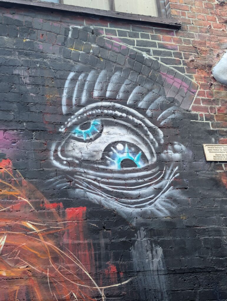 Beim Fotografieren geht mir ein Mann aus dem Weg, und ich sage ihm auf Englisch, dass er nicht extra so weit zur Seite gehen muss. Darauf antwortet er auf Schweizerdeutsch, dass er das Foto nicht stören wollte. Es stellt sich heraus, dass er Catrin und mich gehört hat, mich aber für einen Schweizer hielt. Kein Wunder – er kommt aus der Innerschweiz, und für viele dort klingt ein Vorarlberger eben wie ein Rheintaler. Wir unterhalten uns kurz, und er erzählt, dass er für eine Woche hier ist, um einen Freund zu besuchen, der vor acht Jahren ausgewandert ist. Ich gebe ihm noch den Tipp mit den Graffiti-Straßen, und Catrin zeigt ihm die Orte auf seinem Stadtplan.