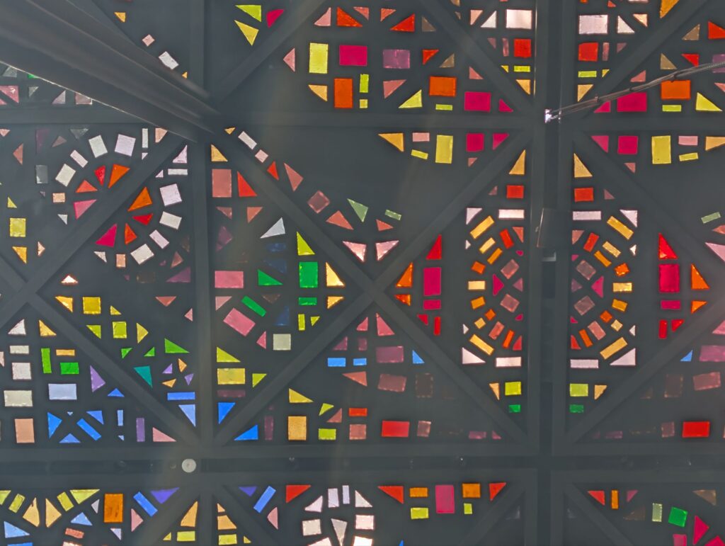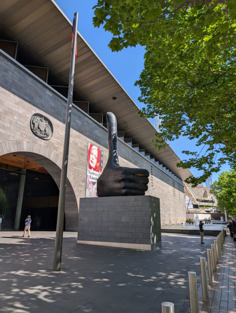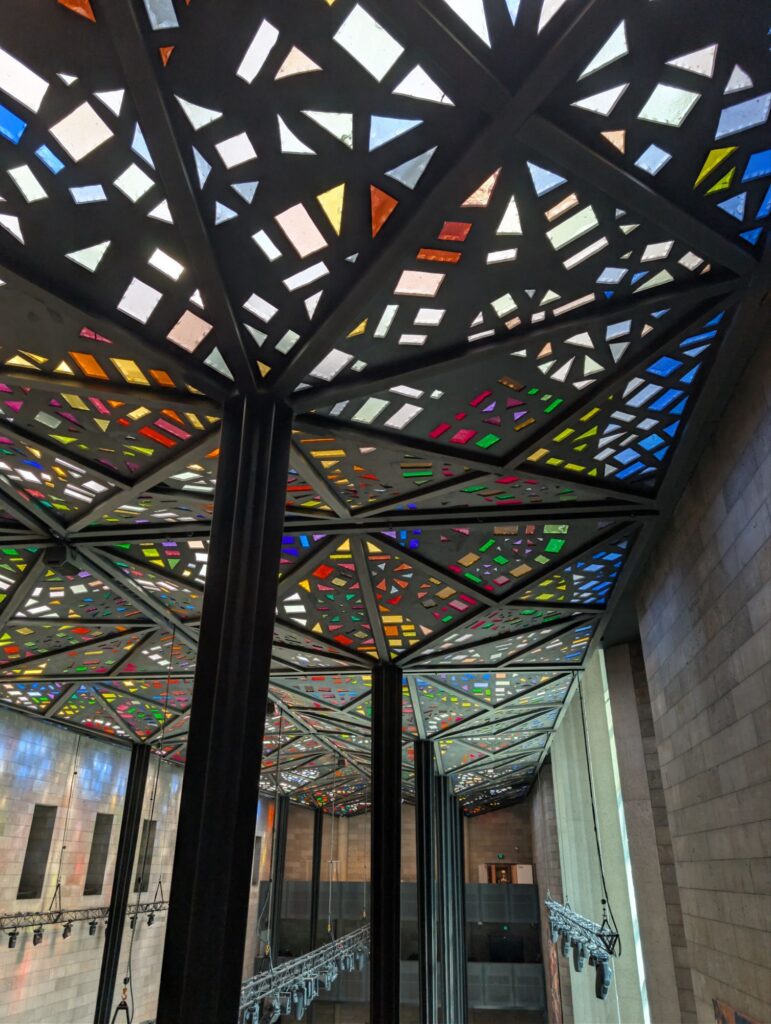 Von dort aus geht es weiter zur National Gallery Victoria. Wir sind beide keine großen Kunstmuseums-Fans, aber unser Stadtführer hatte ja gesagt, dass dort eine beeindruckende Mosaik-Glasdecke zu sehen ist. Also gehen wir hinein und machen uns auf die Suche. Bevor wir sie finden, laufen wir durch einige andere Ausstellungsräume, die uns beide weniger ansprechen. Die Glasdecke selbst ist aber wirklich wunderschön – durch das leicht sonnige, aber windige Wetter leuchtet sie in vielen Farben.