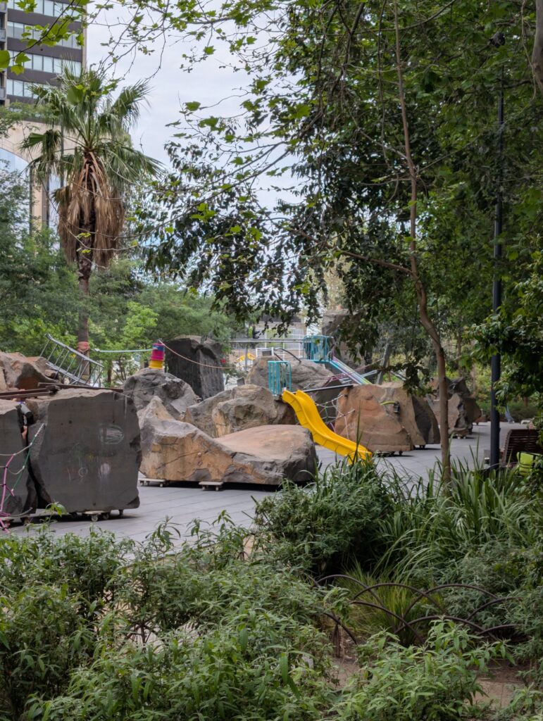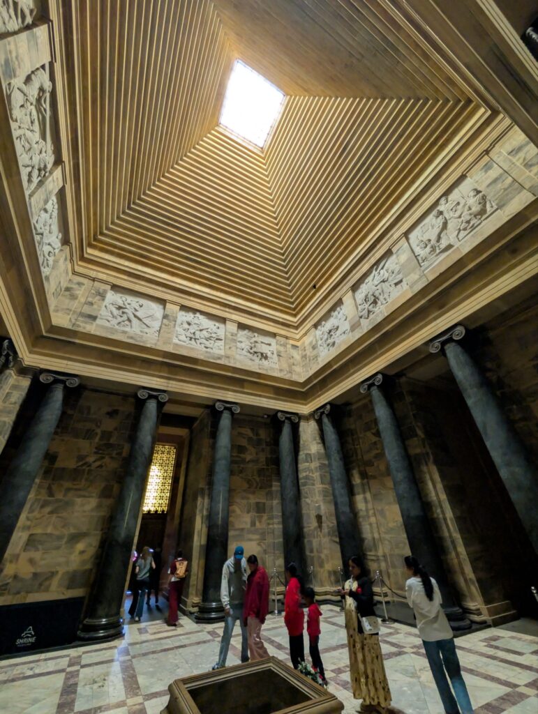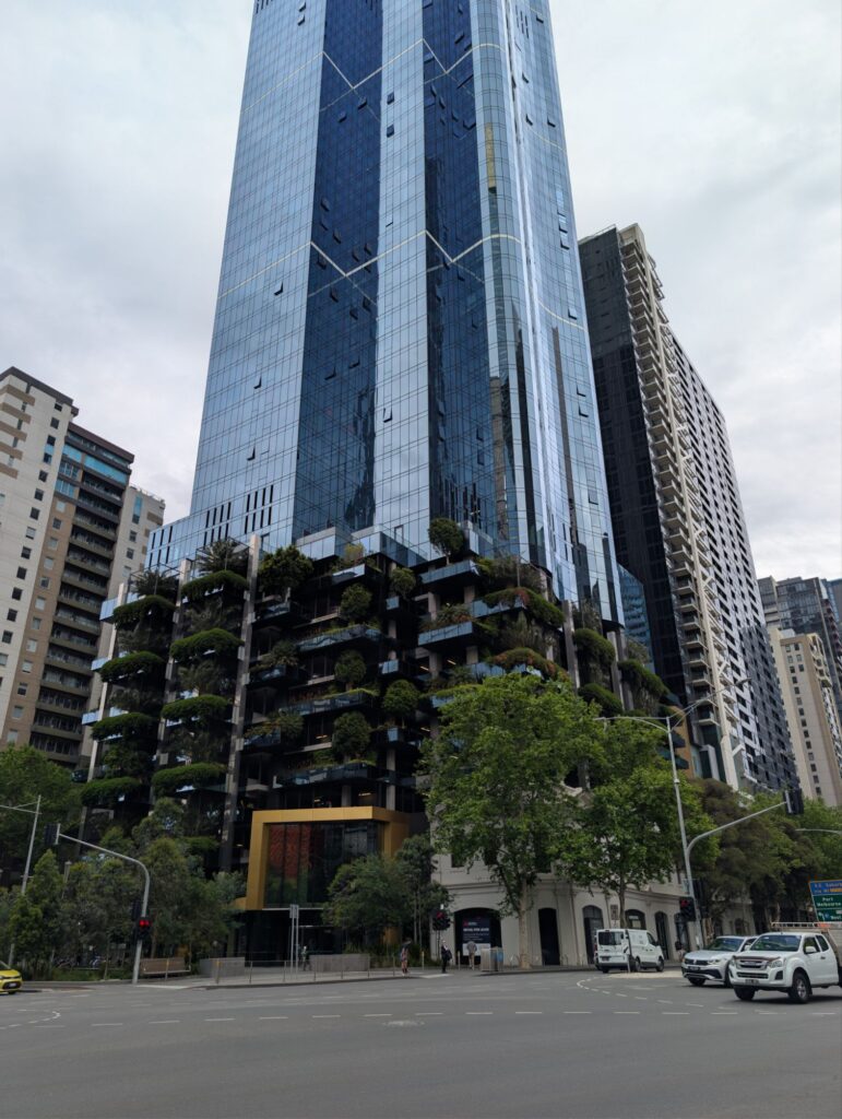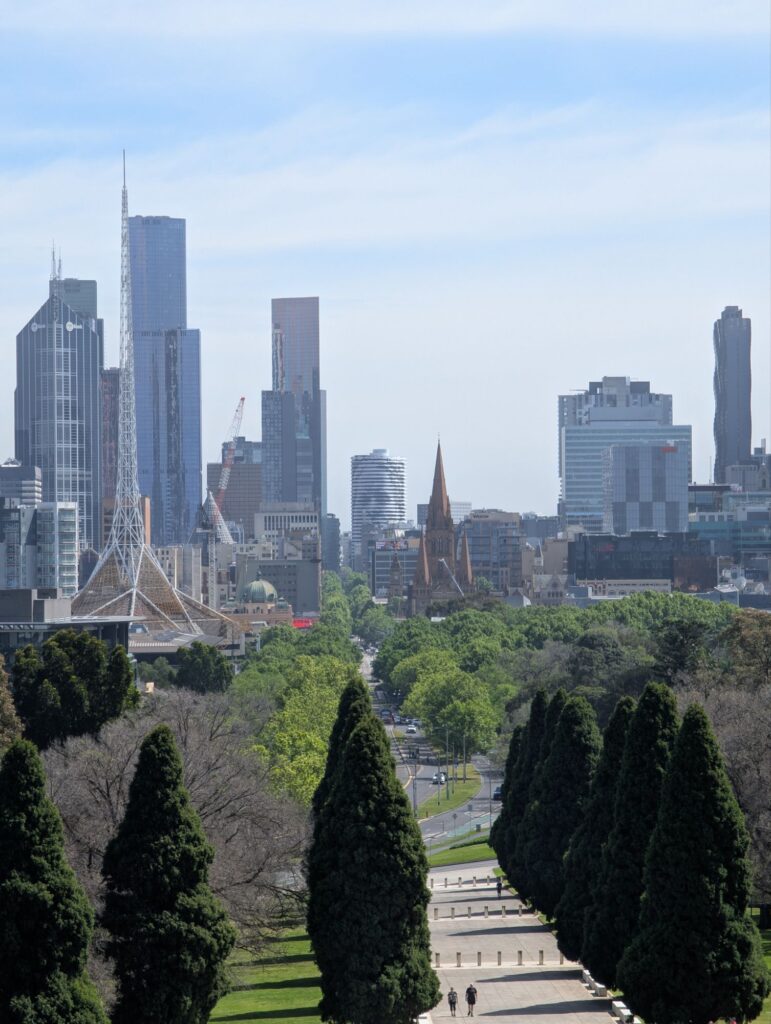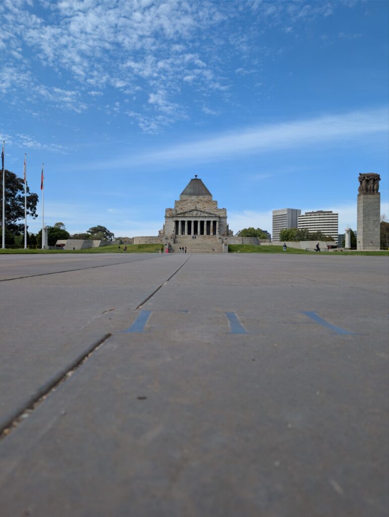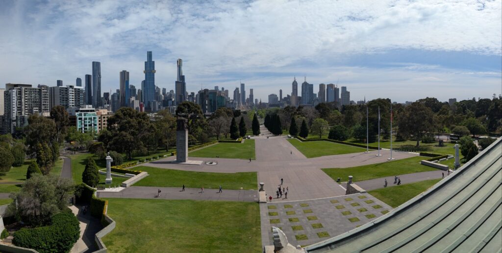 Nach einiger Zeit machen wir uns auf den Weg zum nächsten Ziel, dem Shrine of Remembrance, etwa 15 Minuten zu Fuß entfernt. Sowohl von außen als auch von innen ist das Gebäude sehr beeindruckend. Besonders interessant ist, wie alt und neu hier miteinander verschmelzen, denn um das historische Bauwerk wurde ein modernes Besucherzentrum errichtet. Über mehrere Stufen gelangt man zur Aussichtsplattform, von der man einen tollen Blick auf die Silhouette der Stadt hat.