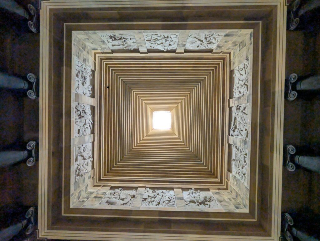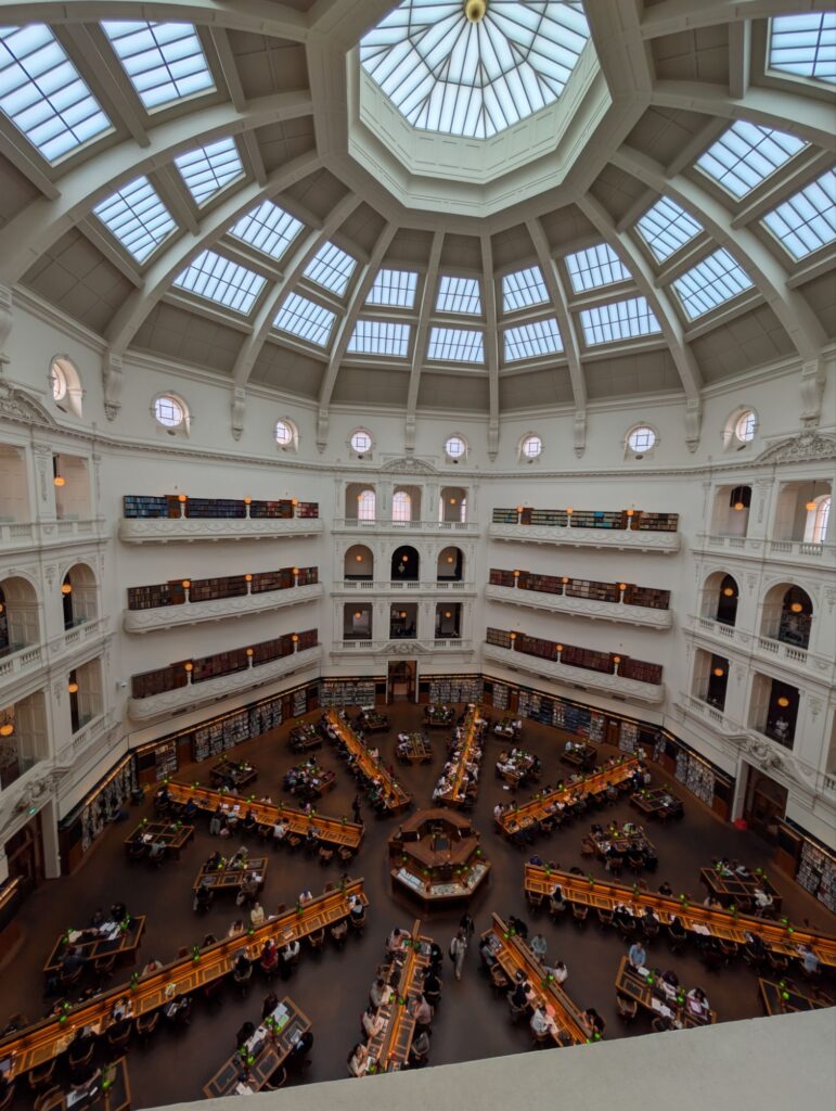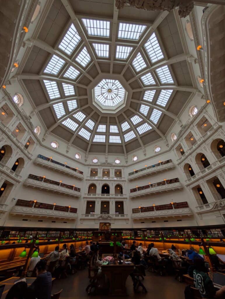 Dann machen wir uns auf den Rückweg in die Stadt. Mittlerweile ist es warm geworden, also ziehe ich meinen Pullover aus. Der Spaziergang zurück dauert rund 40 Minuten, mit einem kurzen Zwischenstopp im Museum of Contemporary Art. In der Stadt angekommen, ist unsere nächste Station die Bibliothek, die für ihre beeindruckende Kuppel bekannt ist. Da meine Füße schon ziemlich müde sind, fahren wir so viel wie möglich mit der Straßenbahn. Die Bibliothek ist tatsächlich beeindruckend – der große Lesesaal erstreckt sich über fünf Stockwerke, und auch hier verbinden sich Altbau und Neubau auf faszinierende Weise.