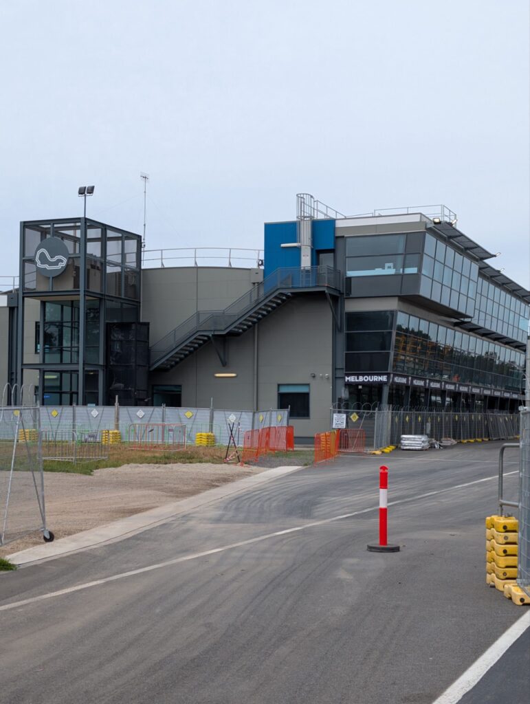 Ich bin überrascht, wie schmal die Strecke ist, und kann mir gut vorstellen, wie spannend das Rennen hier live sein muss. Beeindruckend ist auch, wie viel Aufwand nötig ist, um die Straßen jedes Jahr in eine Rennstrecke zu verwandeln. Nur an wenigen Stellen sind Curbs zu sehen, und die sind nicht rot-weiß, sondern grün oder schwarz. Das Einzige, was dauerhaft bleibt, ist die Boxengasse mit dem dazugehörigen Gebäude – dort wird allerdings gerade gebaut, also können wir nicht alles sehen. Auf der Start-Ziel-Geraden erkennt man noch leicht die Markierungen der Startboxen.