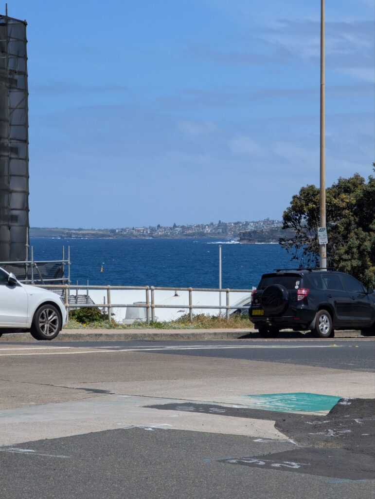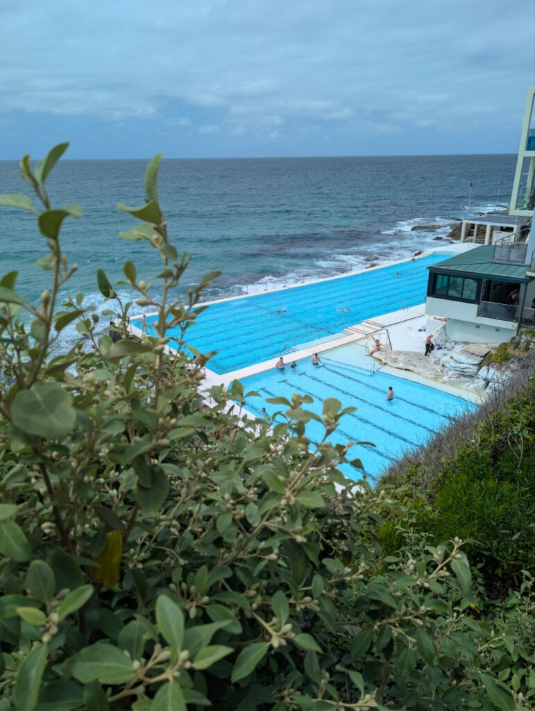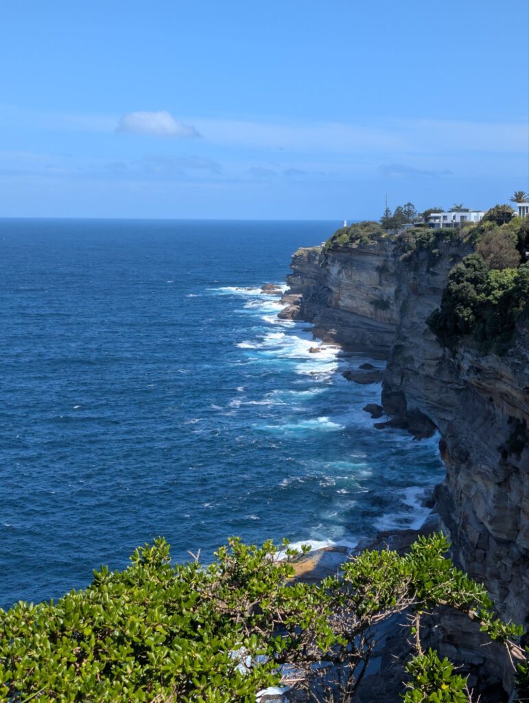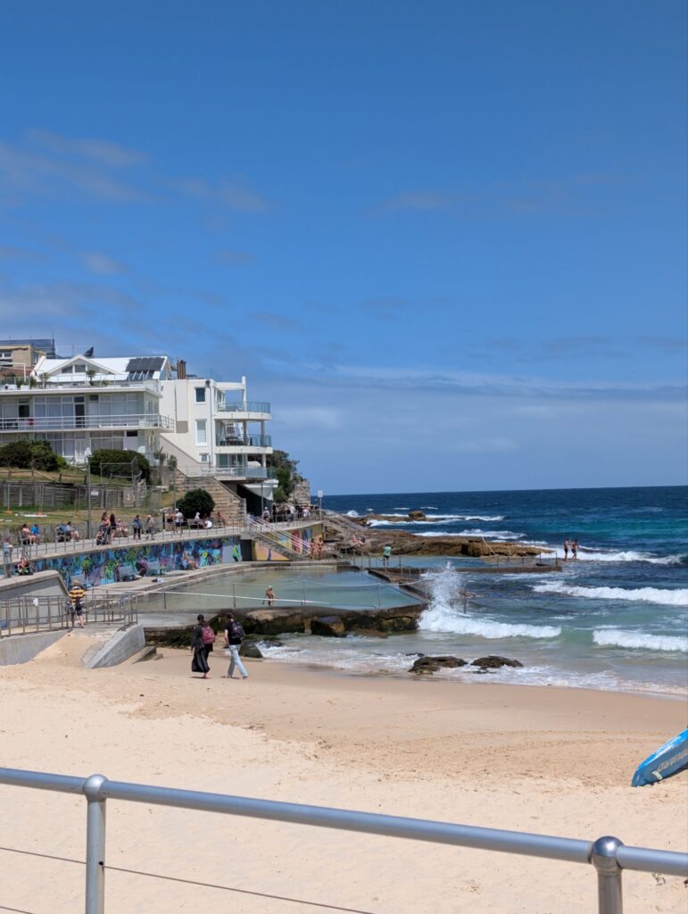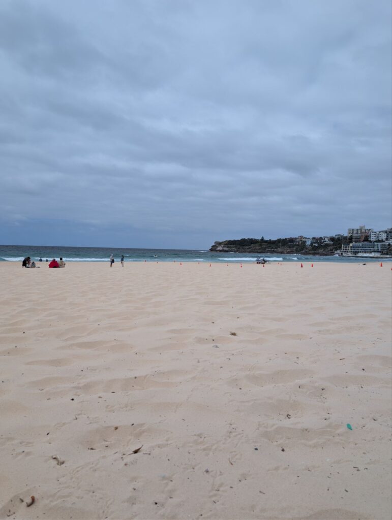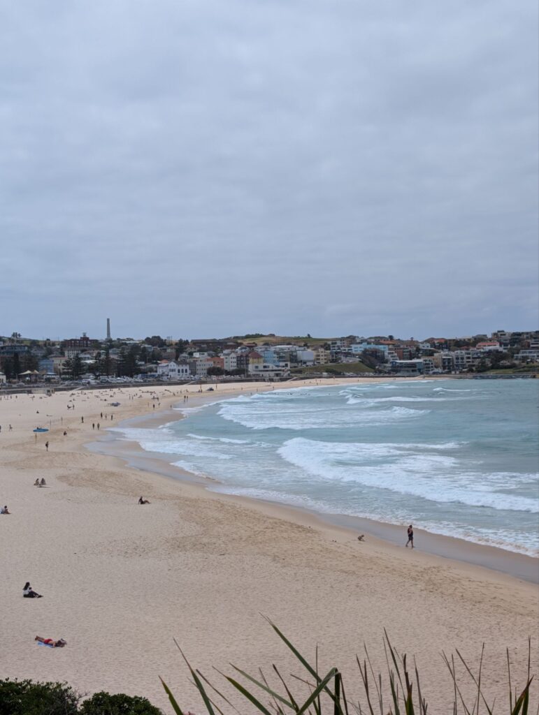 Von Rose Bay müssen wir zuerst quer über die Landzunge auf die andere Seite, wo Bondi Beach liegt. Natürlich hätten wir auch einen Bus nehmen können, aber wir laufen, die Querung dauert gut vierzig Minuten. Am Bondi Beach angekommen setzen wir uns an den Strand und essen etwas, während wir den Surfern zuschauen, wie sie versuchen, Wellen zu erwischen. Nach dreißig Minuten Pause am Strand geht es weiter zu den Sculptures by the Sea, einer Kunstausstellung, die jedes Jahr für einen Monat stattfindet.