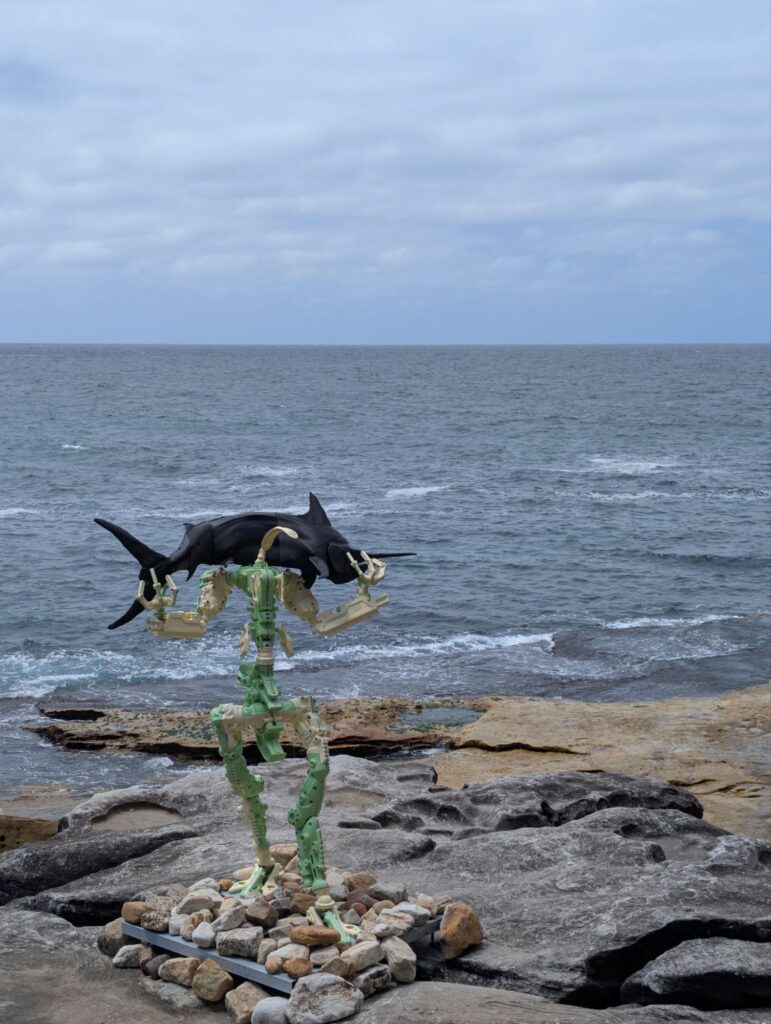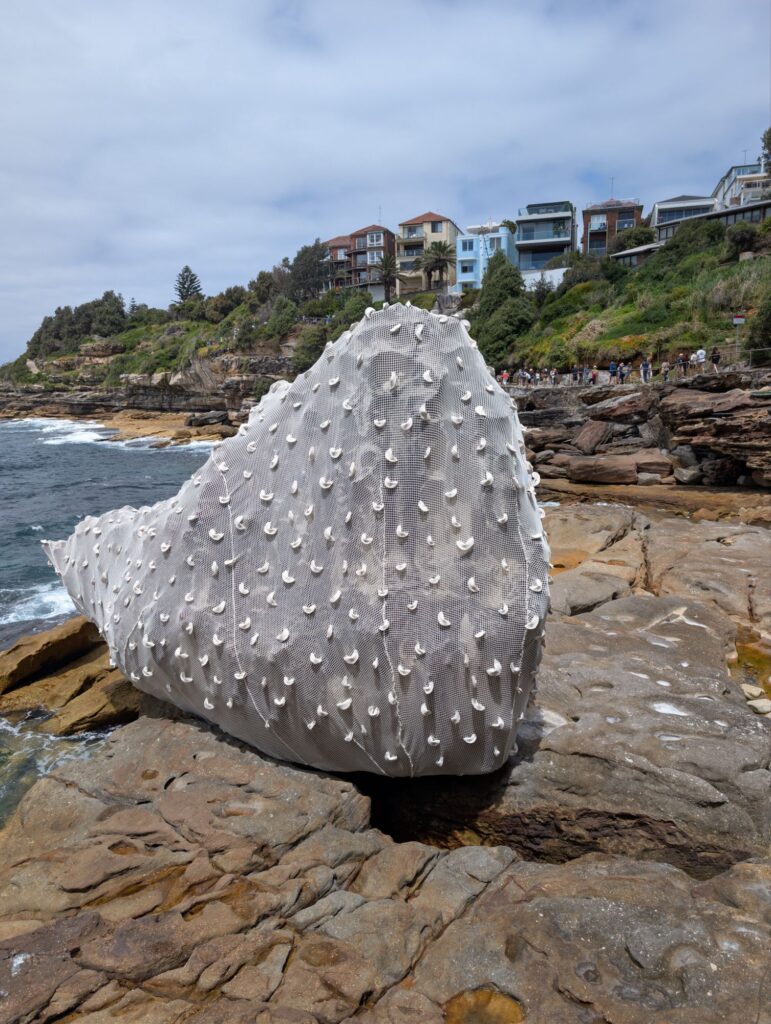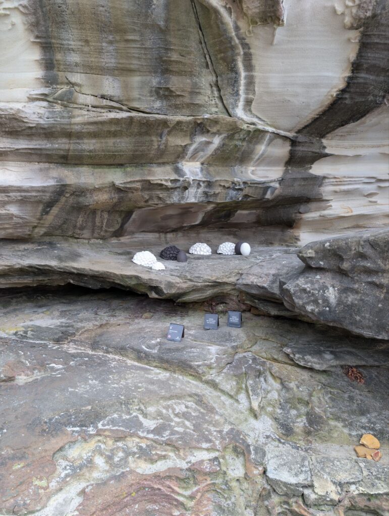 Die Ausstellung beginnt nur wenige Minuten vom Strand entfernt und führt auf eine Anhöhe neben dem Meer. Der Weg ist gut besucht, vor allem viele Schulklassen sind unterwegs. Auf der Anhöhe angekommen, stehen auf einer großen Wiese viele verschiedene Skulpturen. Wir schauen uns die Kunstwerke an, bevor wir in ein großes Zelt gehen, in dem Miniaturversionen vieler Skulpturen ausgestellt sind. Einige dieser Miniaturen kann man kaufen, die Preise reichen bis auf zwanzigtausend australische Dollar.