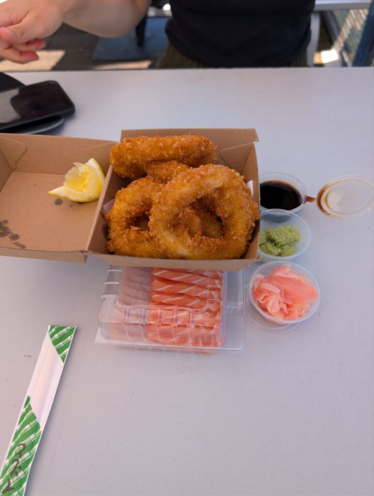 Wir besichtigen die alten Werfthallen, die Gefängnisanlage und andere Gebäude. Gegen 12:00 Uhr geht es zurück in die Stadt in Richtung Fischmarkt, wo wir Sashimi und frittierte Calamari zum Essen holen. Nach der Hauptspeise gönnt sich Catrin noch einen Nachtisch mit Früchten. Gestärkt machen wir uns dann auf zum Paddy’s Market, um Souvenirs zu kaufen.