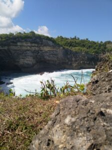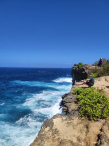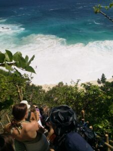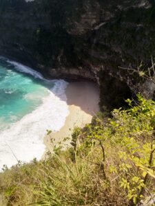 Die nächste Station war dann der Kelingking Beach bzw. die T-Rex Klippe, dieses mal nur knapp 30min Fahrzeit. Auch dort sind wir wieder nicht die einzigen. Wir bestaunen die Klippen von oben und machen uns dann auf den weg runter zum Kelingking Beach. Zuvor hatte Lisa erfahren das man ca. 1h ein Planen muss um nach unten zu kommen und 1,5h für den Weg hoch. Auf dem schmalen Weg war schon ziemlich viel los und viele hatten einfach das falsche Schuhwerk meines erachtens. Man musste schon etwas “klettern” und mit Flip-Flops geht das halt nicht so gut und viele waren damit unterwegs. Wir hatten jedoch beide halbwegs OK Schuhe an, keine Bergschuhe aber besser als Flip-Flops. Wir brauchten auf jedenfall gut 30min nach unten. Unten angekommen wurden wir von einem schönen Strand begrüßt und sehr hohen Wellen. Mit Baden war also nichts aber in die Wellen stehen und schauen das man nicht davon gespühlt wird war für mich möglich.